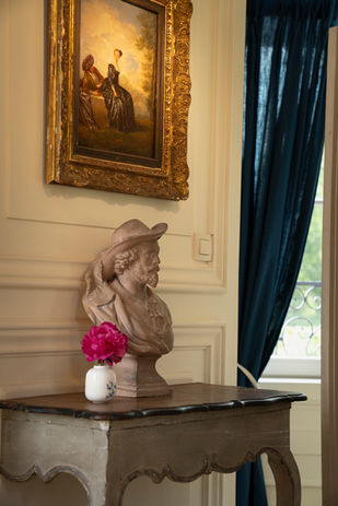 Son univers reconstitué comporte comme il se doit ses grandes baies s’ouvrant sur la campagne et son parc dédié, des meubles d’époque, des toiles romantiques, une vaisselle soignée mais aussi, des portes dérobées s’ouvrant sur les commodités habituelles.